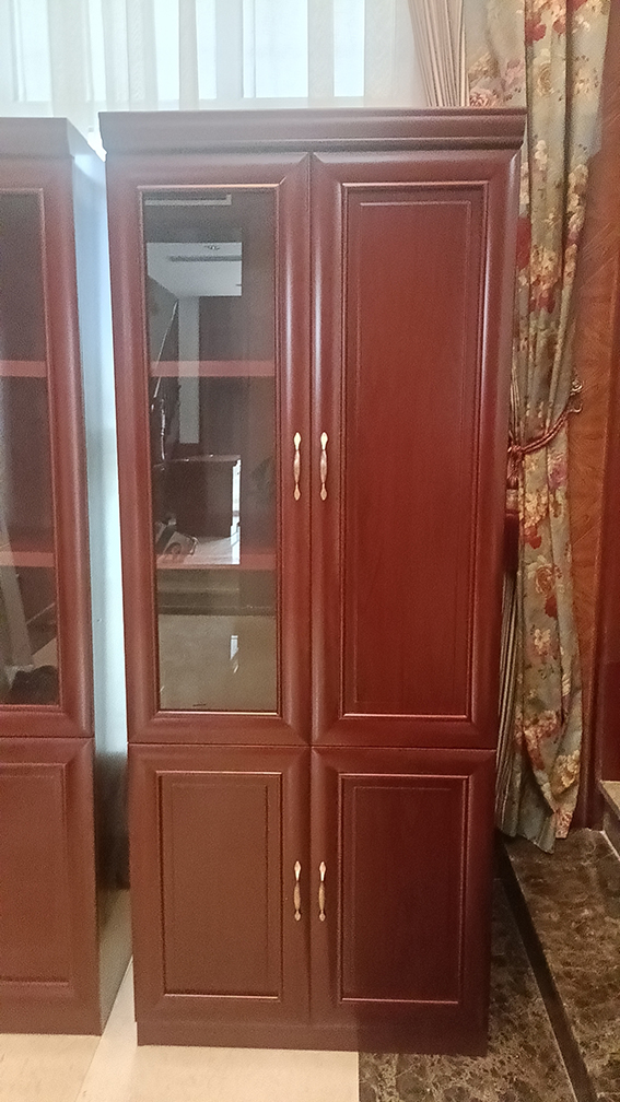二門書柜,上下分體門結(jié)構(gòu),上書柜左邊為玻璃門,門內(nèi)有2層隔板,用于放置文件書籍等,上書柜右邊為木質(zhì)門板,內(nèi)有掛衣桿,用于放置外套等衣物。下書柜為木質(zhì)門板,內(nèi)有一層隔板。